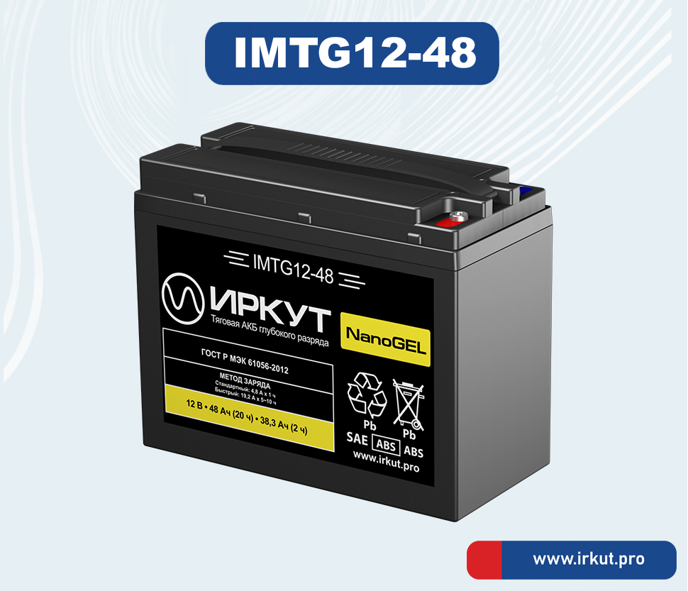 ИРКУТ IMTGНеобслуживаемые тяговые герметизированные аккумуляторы глубокого разряда с гелеобразным электролитом, рекомендованные для питания лодочных электромоторов, троллинга, резервного питания, инвалидных колясок и прочего электротранспорта.